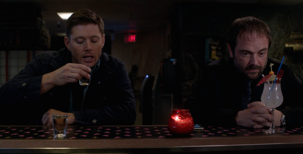 Dean joins Crowley at a bar and orders shots for himself and a fancy drink with a tiny umbrella for Crowley. This seems like their regular bar. I wonder if they like to go because everybody knows their names? Spoke a bit too soon about the varied locations, it seems. Crowley tells Dean that he needs to keep killing: