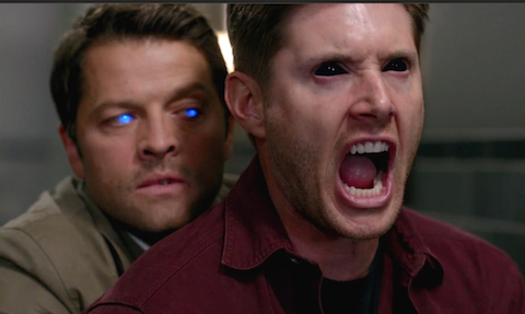 Sam has somehow lost Dean while on his beverage break. Sam begins to search for Dean. Dean is on the hunt himself. While searching for a weapon, Dean passes on a butcher knife and goes for a hammer. Sam goes into the electrical room and puts the bunker onlockdown. Here’s a hint, Dean: Sam’s in the electrical room where the power is controlled. Dean starts shouting about how he is going to kill Sammy. Dean describes, in his shouty voice, how he got away—as he became more human he was able to walk out of the Devil’s trap. Probably shouldn’t tell Sam that in case he captures you again. Sam “traps” Dean in the electrical room. We use the word “trap” very lightly. zSam has lost Dean somehow while on his beverage break. Sam begins to search for Dean. Dean is on the hunt himself. While searching for a weapon, Dean passes on a butcher knife and goes for a hammer. Sam goes into the electrical room and puts the bunker onlockdown. Here’s a hint, Dean: Sam’s in the electrical room where the power is controlled. Dean starts shouting about how he is going to kill Sammy. Dean describes, in his shouty voice, how he got away—as he became more human he was able to walk out of the Devil’s trap. Probably shouldn’t tell Sam that in case he captures you again. Sam “traps” Dean in the electrical room. We use the word “trap” very lightly. Dean goes all Jack Nicholson on the door. Sam surprises Dean with a knife to his throat. Dean tells Sam to go ahead and kill him, essentially double-dog daring him to do so. Sam drops the knife and Dean’s eyes turn black. Before Dean is able to rip out Sam’s throat with his teeth, Castiel springs up behind Dean and captures him with his strong, angelic arms.