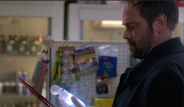 Cas and Hannah have arrived at Levi’s Lil’ Gas and Grocery. Cas is calling Hannah out on her crush: “Emotions, feelings, they’re dangerous temptations.” He’s a heartbreaker. Hannah’s time with Castiel has made her interesting enough to retort, “How very biblical, Castiel.” Snap! Hannah goes into the store. After looking on the shelves for who-knows-what, she finds that Levi’s clerk has been angel-killed (you can tell because he has angel-eye). The rogue angel Adina is in the store waiting for Hannah and Castiel in order to avenge Daniel, who was killed by Cas in the episode “Black.” She beats up Hannah, who was very wimpy in their angel girlfight, and then starts thrashing the weakened Castiel.