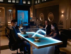 The Doctor opens a registration book, and a cube emerges that provides holographic information: