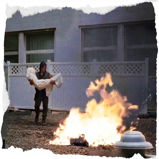 Carol and Daryl walk towards the noise and see walkers standing behind frosted glass—and what looks like what was once a mother and children. Carol goes to kill them, but Daryl stops her, telling her she doesn’t have to. In the morning it becomes clear that Daryl has taken care of the walkers when he brings out a child’s body to be burned. Carol comes out and thanks him. This scene reminds us of all that Carol has been through, what she has lost, and what she has gained. With Rick it seems like having his children made him tougher, while for Carol she didn’t become hardened until after she lost her daughter Sophia.