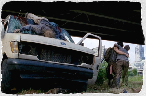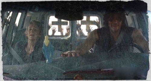 Back in present-day Atlanta, Daryl and Carol walk up to the van with the crosses on it. Carol offers to go into the van because she’s lighter, but Daryl goes in himself, even though the car is half off the bridge. For some unknown reason Carol comes up into the front seat as well. Seems like more weight in the front that is hanging over the edge of the bridge will only make matters worse. He sees the gurney and suggests the van may be from a hospital. Carol says maybe its Grady Memorial. They get out of the van and try to fight their way through the walkers. When they realize they can’t fight through the walkers, they have to get back into the van for safety.