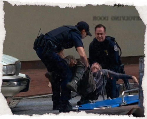 Daryl, Carol, and a limping Noah start running to get into the building across the street that Noah says is clear. Noah falls, and Daryl stops to help him, telling Carol to keep going. Carol opens the door and steps into the street, where the only moving vehicle for miles around immediately hits her. What is the accident rate in Atlanta? It turns out that it is one of the cars from Grady Hospital that hit her as we see policemen get out of the car. Daryl tries to run after her, but Noah stops him with his secret orderly strength. He convinces Daryl to let them take Carol to the hospital where she can be treated. The hospital police get out of the car and put Carol on the gurney, then drive off with her. Noah tells Daryl, “They got guns, people,” to which Daryl rejoins, “So do we.”