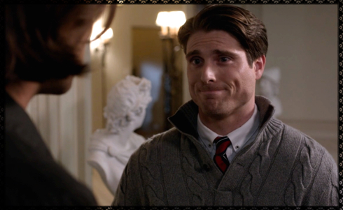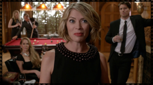 Sam and Dean drive to the Lacroix mansion. “Für Elise” plays when they ring the doorbell, which is a funny touch. Housemaid Olivia answers the door and they explain that they are the Winchesters, and they are there on behalf of Bobby Singer. Olivia asks, “Mr. Singer won’t be coming?” and when they tell her he has passed away, she responds, “Oh. I’m sorry to hear that.” She tells them that they just missed the funeral, but the family is relaxing inside. The Winchesters meet the Lacroix family in the Billiards Room. They first meet Heddy, Bunny’s cousin, who asks them if they are part of the Westchester Winchesters. She introduces them to her sister Beverly, Bunny’s youngest brother Stanton and his “child bride” Amber, and Bunny’s great-nephew Dash (“Harvard Business”). When Dash asks how they knew Bunny they explain that their surrogate dad, Bobby Singer, did. We thought maybe they would describe him as an uncle, as that was how we were first introduced to Bobby, but its nice to hear them refer to him as a father since they had been through a lot together. Bobby was the one that told them, “Family don’t end with blood,” in “No Rest for the Wicked” (S03E16).