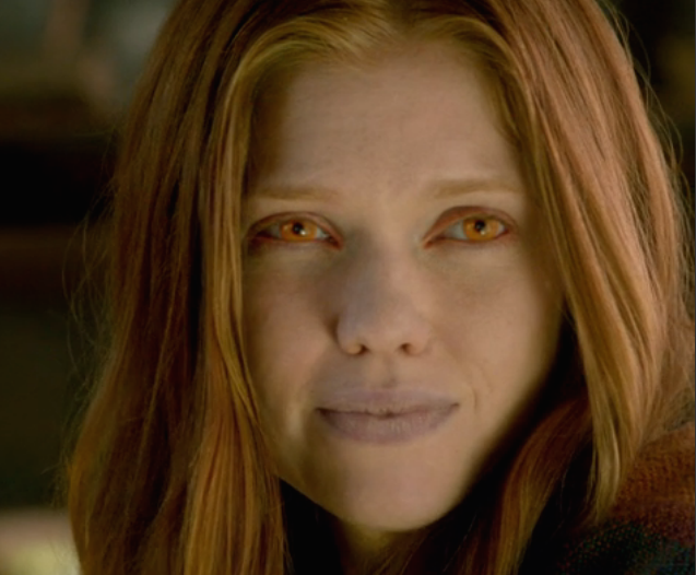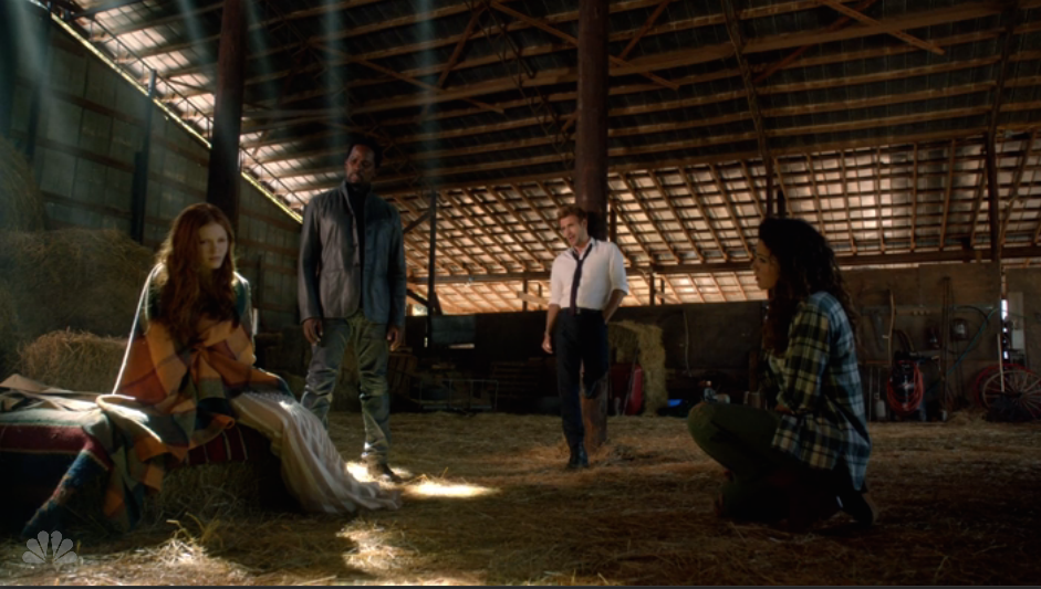 They take the weakened angel to a barn that Zed says “looks abandoned.” (We suspect the barn’s not abandoned at all, as there’s a tractor outside, and there are a couple of nice wool blankets with no signs of rodent chew-holes in them on fresh hay bales inside. Maybe Zed considers any premises that aren’t inhabited at any given moment “abandoned.”) The angel’s name is Imogen, and she says that she was taking a dying mortal to Heaven when the man pulled a feather from her wing, causing her to fall to earth and the man to be revived. Wing damage is one of the only ways for an angel to physically enter the mortal plane. (“Piss-poor design, if you ask me.”) Zed is chuffed to be seeing a real live angel. Imogen (played by the lovely Megan West) has crazy golden angel eyes like Manny, but with her copper hair and silvery pall we can’t help but think she looks a little like a Nova Scotia duck-tolling retriever. (She also reminds us a great deal of Chantinelle, aka “Ellie,” a succubus of Constantine’s acquaintance from the comics.) Manny shows up again, but Zed can’t see or hear him in his spirit form. She wanders around with her arms outstretched, clumsily trying to find him while he and Constantine talk. John berates Manny for not having been more help earlier, but Manny had nothing to share: