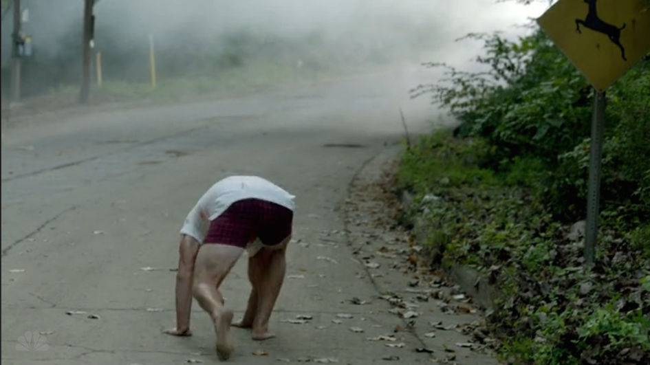 Nate, the young man with the freshly regrown leg, is with a doctor who is looking over before-and-after x-rays. The doctor is happily baffled, but Nate is starting to sweat and is feeling feverish. Suddenly his pupils go soupy, the lights in the exam room start to blink on and off, and Nate leaps from the exam table and kills the doctor with his bare hands before walking out, still in boxers and bare feet.