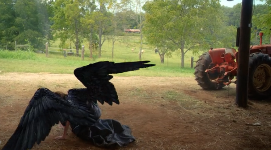 John brings her along as he follows his nose to a nearby pond, where all of the fish are floating on the surface. “Pobrecitos.” The power needed to effect the healing is draining energy and life from the land around the church. John tries to call for Manny to ask about the Enochian, but he gets no answer. So he draws a sigil of an ouroboros in the sand and performs a ritualistic summoning, but adds “Please?” to the end, which works. Zed becomes Manny, advises John to face the sun, and suddenly Zed is back. He asks her to stand by him, facing the sun, and to hum the melody of the Enochian chanting they heard from Zach earlier. Soon they hear the sound of a beautiful voice repeating the song. John says, “Echolocation,” which doesn’t make any sense, but whatever. (“Enocholocation,” maybe.) They follow the sound of the voice to a tree in a field, where they find an angel lying in a layer of fallen leaves. She rises and spreads her wings.
