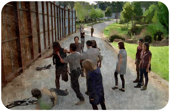 Daryl Dixon (Norman Reedus from strangling (Michael Traynor). Noah (Tyler James Williams), Maggie Green (Lauren Cohan) and Tara Chambler (Alana Masterson) stand nearby. The Walking Dead episode Remember S05E12