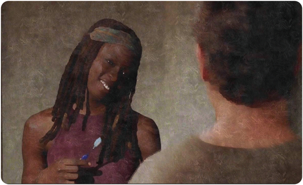 silk Michonne toothbrush Rick Remember The Walking Dead Published March 4, 2015 at 600 × 368 in The Walking Dead S05E12 Recap: Remember ← Previous Next → Michonne explores the sensual act of brushing her teeth – and she likes it. Michonne (Danai Gurira) talk to Rick Grimes (Andrew Lincoln). The Walking Dead Remember (S05E12)