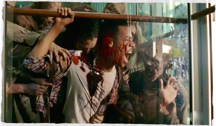 Things look grim for Glenn, Noah, and Rick, trapped in the revolving door. Then, Eugene drives past the front entrance, playing loud music, to draw the walkers away. Despite Glenn’s instructions to work together to get out, Nick panics and decides to abandon them once more and make his own escape. This causes the door to revolve and Noah to get dragged out of the revolving door by the walkers still inside the building. Glenn helplessly watches on the other side of the glass door as the walkers eat Noah alive. It is probably one of the most disturbing scenes to date on The Walking Dead. Nick runs to the van and tries to force Eugene to leave. But Eugene remains strong, even risking his life to try to stop Nick. Glenn arrives and pulls Nick out the van and starts punching him, yet has the restraint to resist killing him.