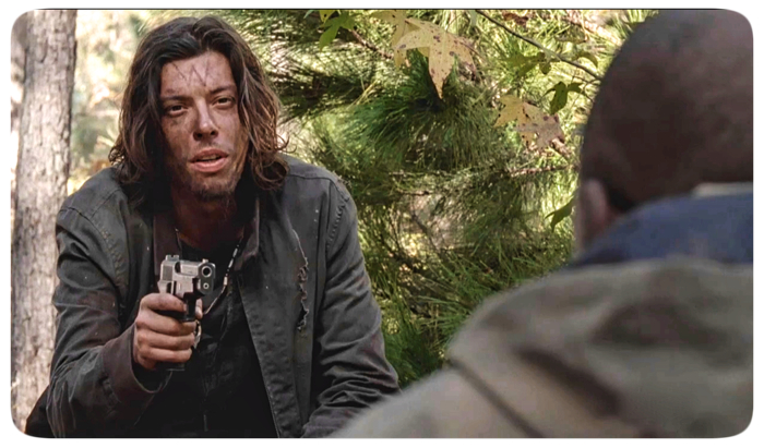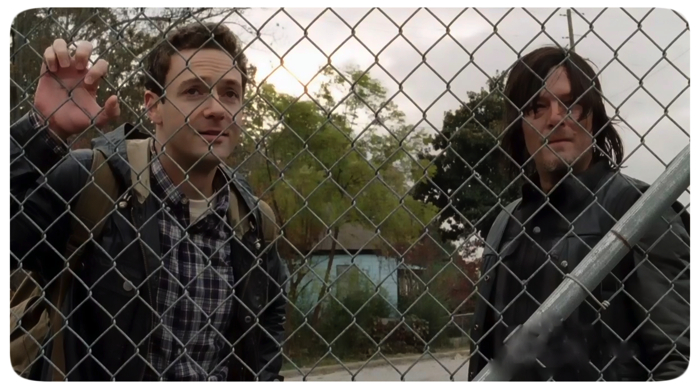 Daryl and Aaron are out on recruiting duty. Aaron tells Daryl about another group he had brought into Alexandria, but who didn’t work out. Aaron, Aiden, and Nick had to drive them away and leave them with a day of supplies but no guns. He tells Daryl that he can’t make that mistake again.