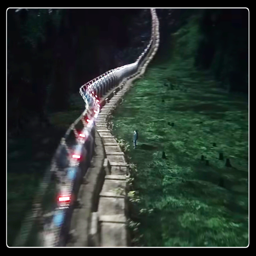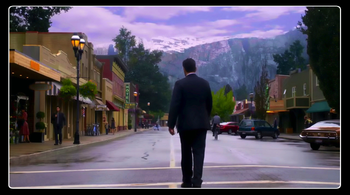 Ethan decides he’d better make a run for it, stealing a car and trying to drive out of town. Yet, just when he thinks he’s made the town boundary he finds himself driving back into town again. He leaves the car on the road and tries to find an exit in the woods. Much to his surprise, and ours, Ethan comes upon a huge concrete wall with an electrified fence on top. The sign on the fence warns, “Risk of death. Return to Wayward Pines. Beyond this point you will die.” As the camera pans upward, we can see that Wayward Pines is mountain valley surrounded by concrete walls. When he returns to his car, the sheriff arrives.