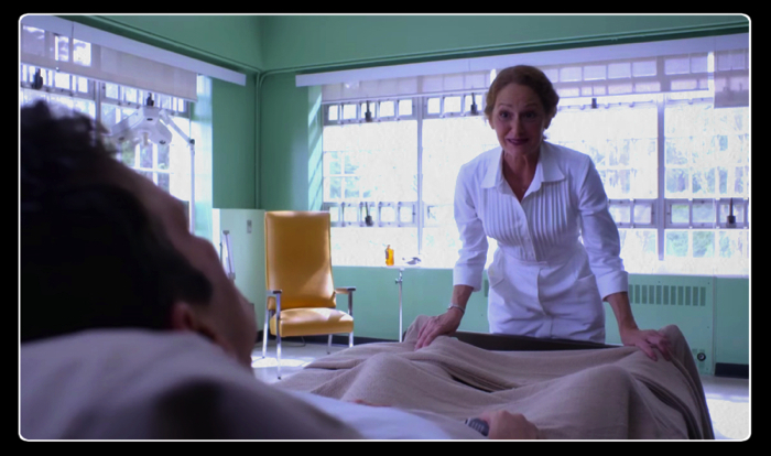 Ethan finds himself in the hospital once more. Psychiatrist Dr. Jenkins (Toby Jones), who knows that Ethan has a history of mental illness, tells him there is bleeding on his brain, resulting in a dissociative breakdown. Ethan explains that he’s not delusional, telling Dr. Jenkins, “You see, it’s not me. It’s the town.” That always works as a defense. Dr. Jenkins informs Ethan they’re going to take him to surgery to drain the hematoma, and when he protests Nurse Pam gives Ethan a sedative. As Ethan lays handcuffed to a gurney outside a room with scary surgical instruments, the bartender Beverly comes to the rescue. Together they manage to attack Nurse Pam and get out of the hospital, hiding in a cemetery vault. Before the sedative completely knocks him out, Beverly tells him that the agent he found was killed for trying to escape. She tells Ethan that she came to Wayward Pines in 1999, strangely believing that she has only been there for a year.
