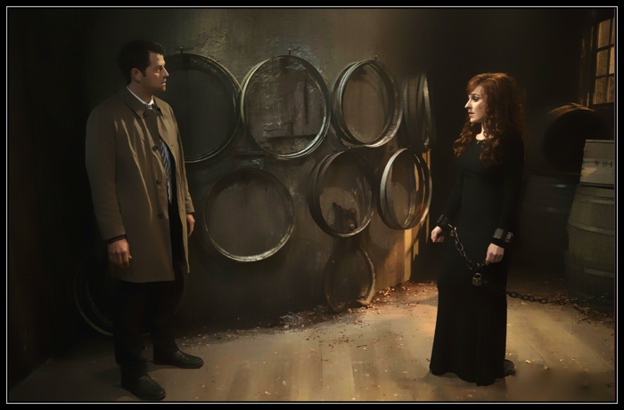 Cas Rowena 3 Supernatural Dark DynastyCastiel locks up Rowena in a different room to give Charlie some space. When he returns to check on her, Charlie is gone. Charlie has gone to a motel, registered as Carrie Asimov, for some private time to work on the Codex. The peace and quiet of the Blackbird Motel helps Charlie to break the code. Her alone time doesn’t last for long, because the Stynes have found her.