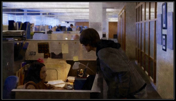 At the Sheriff’s office, Ethan finds Pope and Nurse Pam deep in discussion. Our two favorite characters—together! The receptionist must be on a smoke break. Ethan and the Sheriff trade threats. The phone rings and Nurse Pam answers it, then conveys the message: “Sheriff Pope, that will be all.” Someone wants Sheriff Pope to stand down. Ethan realizes these two wacky characters are not in charge, and he leaves.