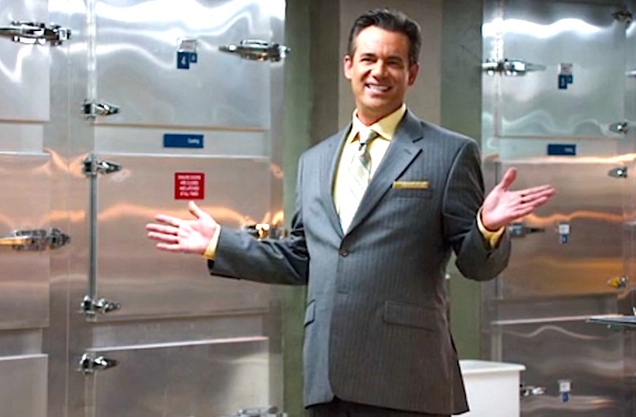 Speaking of zombies and bad news, Blaine returns this week, having made a deal to provide a rich customer with the brains of American astronaut Alan York. Blaine infected the guy just as he was to begin training for his trip as a passenger on a manned spaceflight (and you can’t pass a physical without a pulse), so he wants to experience a trip to space in the only way he can now—by eating astronaut brains. Blaine carefully prepares several astroburger delicacies in clear clamshell containers, adding a little spaceman sticker to each. Meat Cute really does pay attention to the little presentation details. Regardless of what Major has been telling his friends, however, he is still on the hunt for the truth about zombies, and steals several yellow coolers of Alan York brains out of the Meat Cute delivery van. He brings them to Liv’s in order to prove to her that zombies exist. Yeah, Major, she knows. She’s a zombie video star.