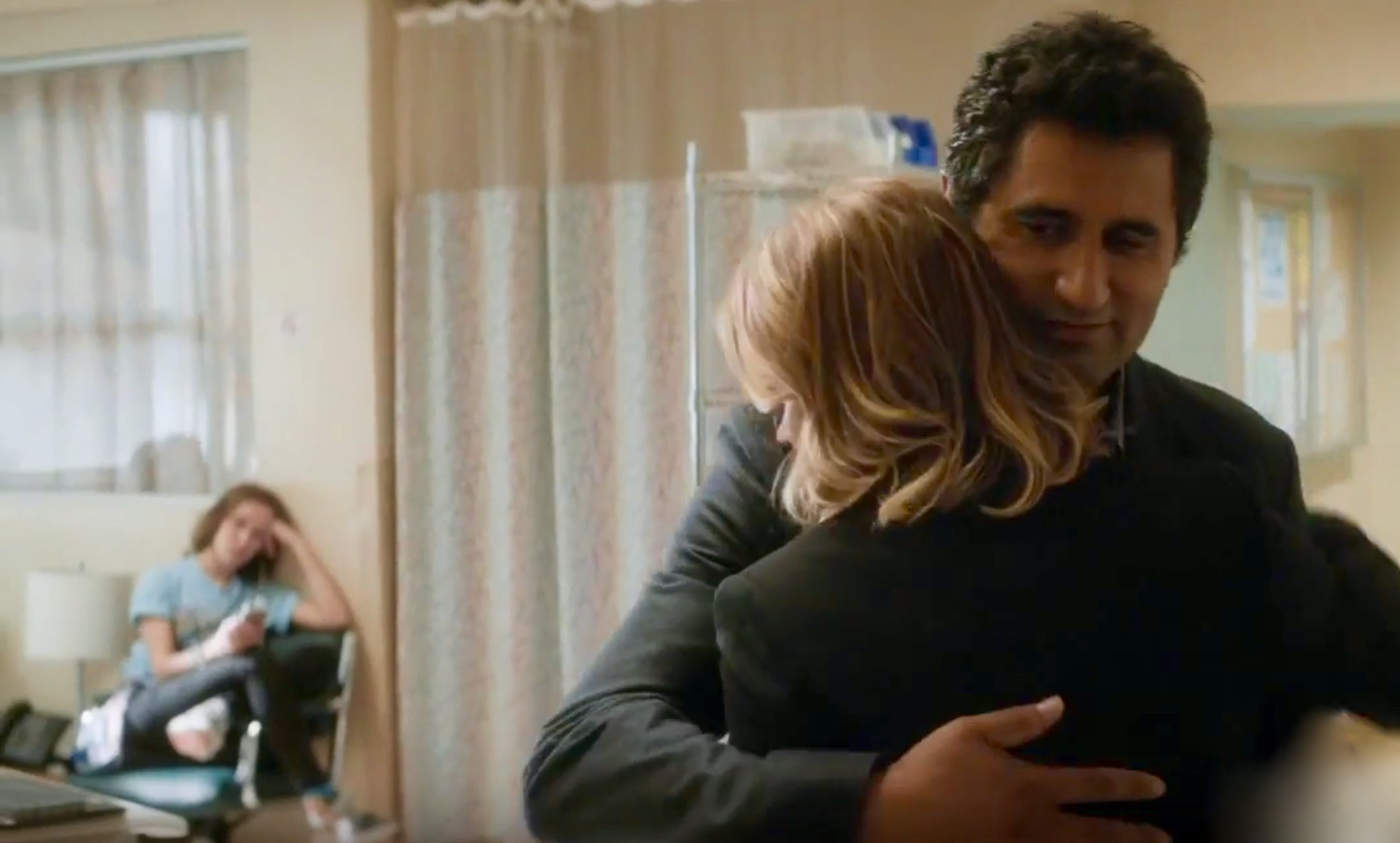 Travis Manaway (Cliff Curtis) hugs Madison Clark (Kim Dickens) at the hospital while Alicia Clark (Alycia Debnam-Carey) sits in the background.