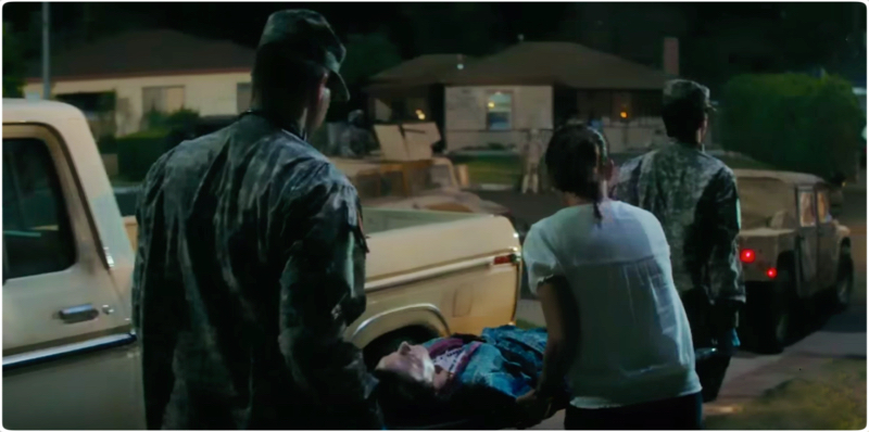 The National Guard commander, Lt. Moyers (Jamie McShane), has an announcement for the neighborhood. He tells them that the tide has turned and they’re on the offensive, and they won’t be evacuating. When the crowd starts to complain about electricity and asks where those outside the fence were evacuated to, he tells them that they’re the lucky ones: “You guys—you get to stay in your homes, ride this thing out, all right? So, relax, count your blessings, be nice. So I don’t have to shoot you.” He gives the impression that he’s joking, but we believe he’d do it. The National Guard is enforcing security measures such as staying within the fenced area, not driving, and staying inside after curfew.