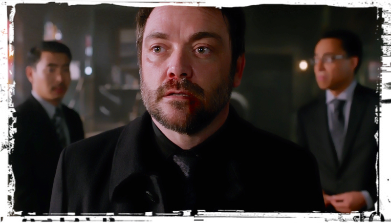 Elsewhere, Castiel is crouching in a barn, hiding. He is still suffering from the attack-dog spell and doesn’t want to hurt anyone. He remembers putting a knife in Crowley, but we see no glowy after effects to make us think Castiel really killed him.