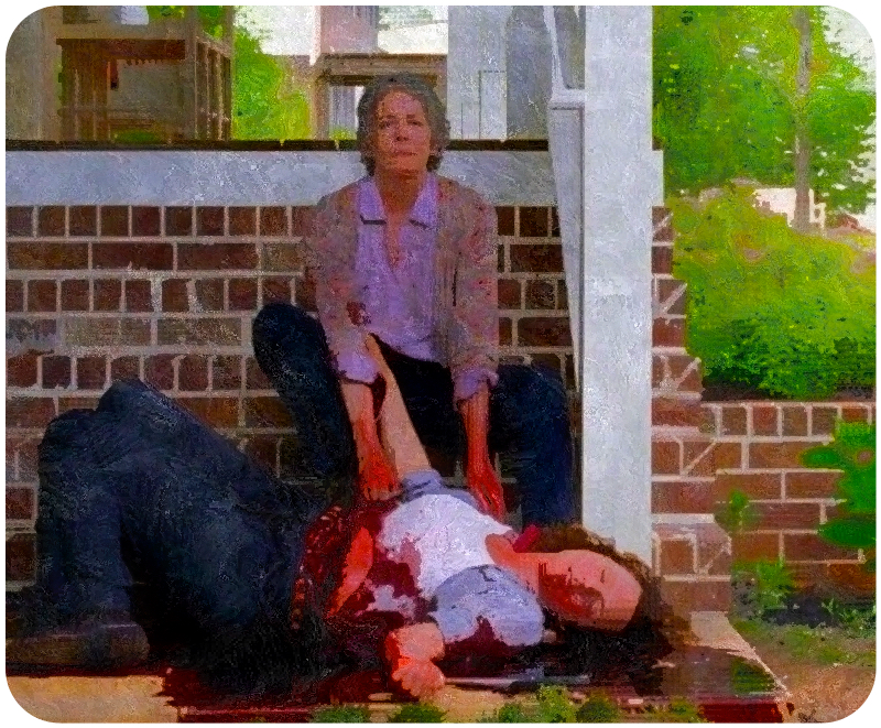 Carol kills one of the Wolves who just sliced Erin, the woman who had complimented Carol’s cooking earlier. She holds the crying Erin in a motherly embrace, comforting her and trying to quiet her. Then Carol finishes the dying woman off with her knife. At least we assume she was dying. Carol has to take a breath and steels herself before she can continue.