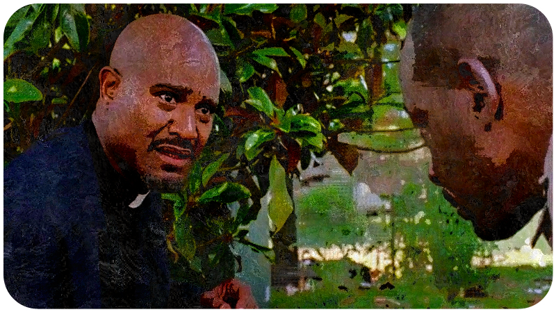 Elsewhere Carl is walking Baby Judith down the street. He sees Ron and Enid hanging out, but before Carl can turn around and avoid an embarrassing teen encounter, Carl is intercepted by Father Gabriel. Everyone’s pretty unhappy about Father Gabriel dissing them to Deanna, including Carl. Father Gabriel acknowledges that his actions were motivated by his own self-doubt. He asks Carl if he’s still willing to teach him how to defend himself. Carl is willing, as long as Father Gabriel confesses his sins to the group. As he walks on, Carl catches Enid’s eye as she and Ron hug.