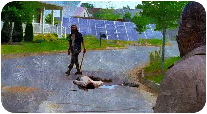 After putting a casserole in the oven and turning on the timer, Carol disdainfully watches neighbor Shelly smoke in the yard. It appears Carol’s barb has gotten Shelly outside of the house for her smoke break. Suddenly, a man runs behind Shelly and kills her with a machete. WHAAA? Alexandria is under attack.