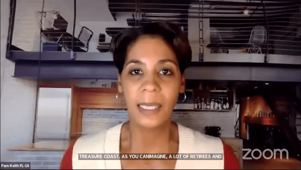 There we so many people on the zoom call, congressional candidate Pam Keith couldn’t get in until after the episode watch party had started. Keith is an African-American veteran running against an incumbent and another independent candidate. She described the importance of the seat she is running for and how it could shift the balance in Florida.
